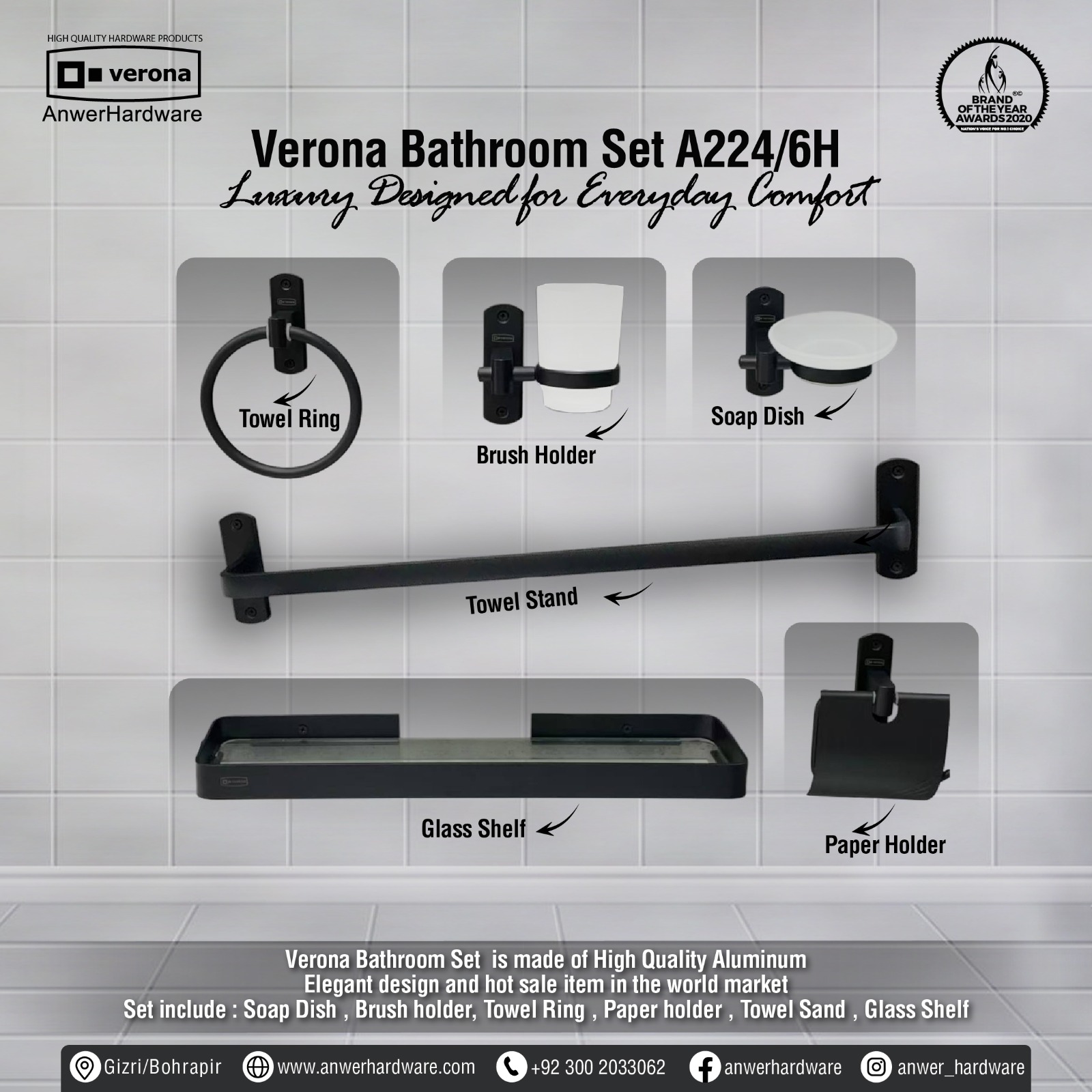 Set include : Soap Dish , Brush holder, Towel Ring , Paper holder , Towel Sand , Glass Shelf